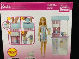 Includes ice cream shop, Barbie doll (12 inches) and ice cream shop accessories: 2 dough colors, 2 bowls, 2 cones, 3 decorative toppers, 2 spoons, cone holder and register.