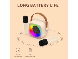 Long Battery Life: Our mini karaoke machine is equipped with a 1800mAh high-efficiency lithium-ion battery, ensuring uninterrupted music playback for up to 5 hours at 50% volume. The microphone also has a built-in 600mAh high-efficiency lithium-ion battery. Whether dancing indoors or partying outdoors, kids can enjoy themselves without any interruption, making it an ideal choice for outdoor gatherings, upstairs parties, or even for carrying it on the go.