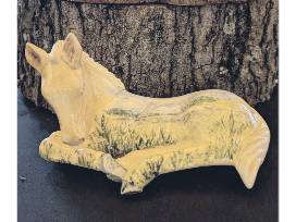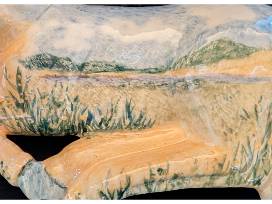 The horse is painted with underglaze and then covered in a clear glaze. She wanted the horse to be in the landscape as well as the canvas for the landscape.