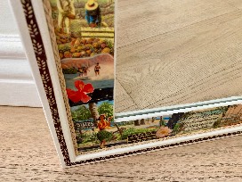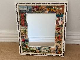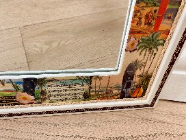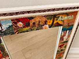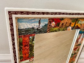 This white, framed wall mirror has been artfully covered with a custom, Hawaiian collage by Julie Lauritsen Designs.