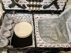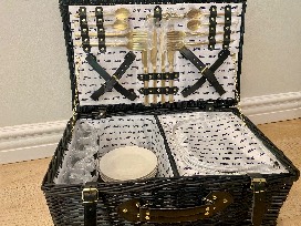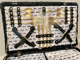 This sleek picnic basket is the perfect way to show your team pride! Includes 4 place settings (spoons, forks, knives, salad plates, cups) and a built in cooler.