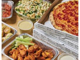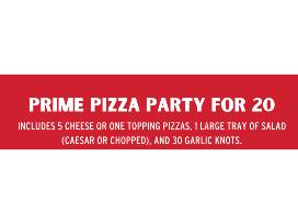 Includes 5 Cheese or One Topping Pizzas, 1 large tray of salad (Caesar or Chopped), and 30 Garlic Knots.
