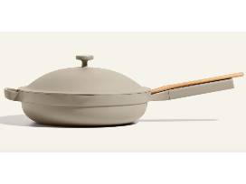 This steam colored 2.6qt Always Pan by Our Place, comes with wooden spatula and steamer basket.