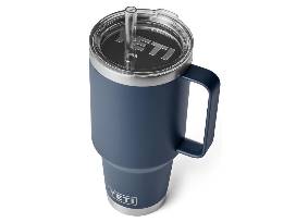 A beautifully engraved design featuring our logo set on a navy blue YETI Rambler 42 oz Straw Mug w/ straw lid.
