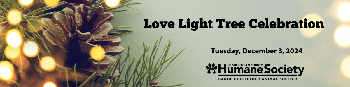 With a minimum donation of $25.00, we will add a Love Light to the Holiday Tree at the Humane Society of Sheboygan County. Love Light Pledge cards are available upon request so you can notify a person (or a family) that you have purchased a Love Light in their honor or memory of a loved one. We will also be listing the Love Light names on our lobby screen.