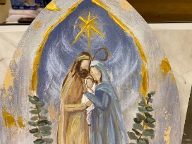 Jesus, Mary, and Joseph under Christmas star on uniquely shaped canvas.