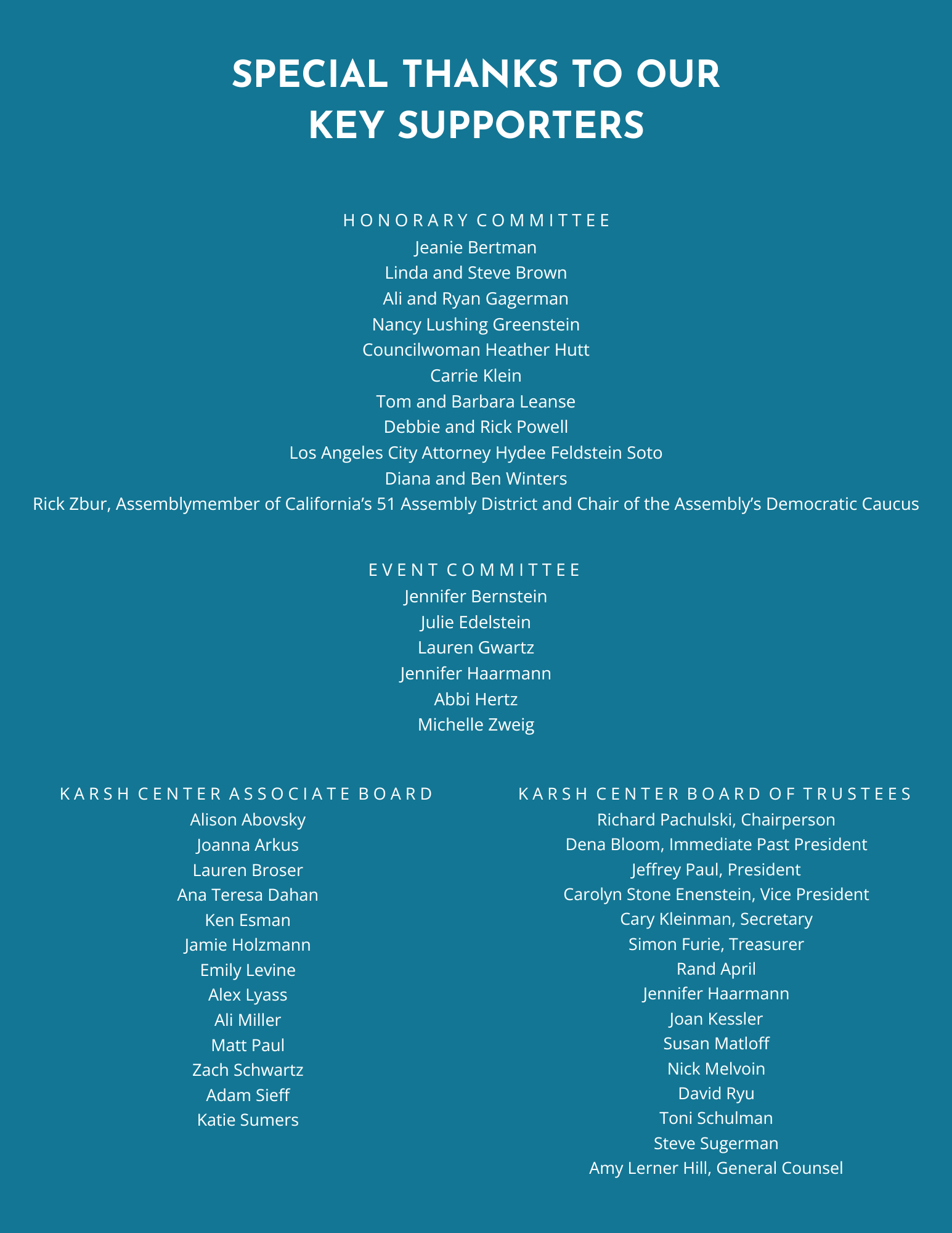 This special event on May 4th, 2025 will bring together passionate supporters on Wilshire Boulevard Temple's rooftop for a night of delicious food, handcrafted cocktails, live music, dancing, and exclusive silent auction items, all in celebration of the transformative impact of the Karsh Center. This event will directly support the Karsh Center's mission to provide accessible social services-from addressing urgent needs like hunger to fostering long-term financial stability for over 3,000 individuals and families.