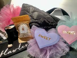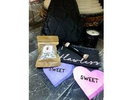 A truly stylish combination from Blonde Boutique of Glen Ellyn. First a really cute sling bag in black along with a flawless makeup bag and dual brush. Plus, a signature Blonde candle in black. Plus, a tea bag bath soak. Style and luxury what a package!