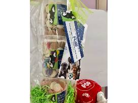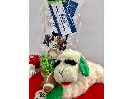 A tower of delicious yogurt puppy kisses from Two Bostons. These are a safe treat that is good for digestion. They are all yogurt so good for you too! Plus, a very cute Lambchop toy football style.