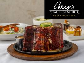 Wow! Enjoy Perry's Legendary pork chop dinner for two! Carved Tableside! Accompanied by soup or salad plus, a dessert for two. Located in Oakbrook Center. You will love this meal in elegant surroundings plus, a pork chop that is slow roasted for 6 hours! Delicious!
