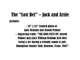 1Capturing a candid moment in black and white photography of two golf legends paying off a wager among friends. Arnold Palmer is graciously paying Jack Nicklaus off for a friendly wager! What a collector's item from 1967! Framed and it will be shipped to you! (19"x23")