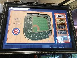 A fabulous unique 3D replica of historic Wrigley Field. It is framed with a collage of historic iconic moments like the World Series win in 2016, 1908 and 1907. Mr. Cub's home run hit at 500 and more!