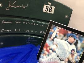 Wow! An official seat back from original Wrigley Field. It is signed by Kerry Wood and he also wrote in the line score and 20 strike out information from his iconic strikeout performance against Houston on May 6th 1998! What a find!