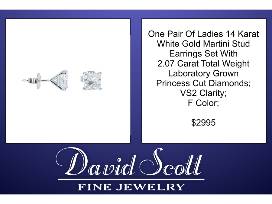 Set in 14k white gold, these princess cut diamonds totaling 2.07 carats will be sure to catch anyone's eye. These are laboratory grown diamonds with VS2 clarity and F coloring.