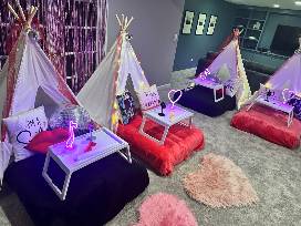 - Up to 8 tents which include decor pillows, twinkle lights, breakfast tray, neon light, twin air mattress with bedding and more