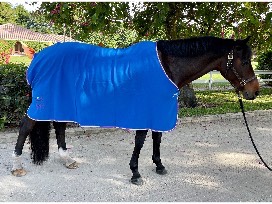 The blue Horseware Ireland Amigo cooler is outlined in white and purple and made of brushed polyester that wicks moisture away from your horse. The cooler includes an easy fix velcro with velcro front fastening. Size 78