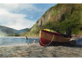 Photo Description: A realistic, detailed watercolor painting capturing a tranquil, sunny afternoon at Bob Marley Beach in St. Thomas, Jamaica. The scene features beachgoers set against the lush Jamaican mountainside, with the iconic rasta-colored fishing boat, a familiar sight for regulars.