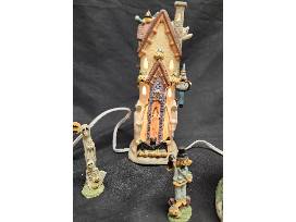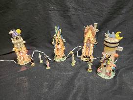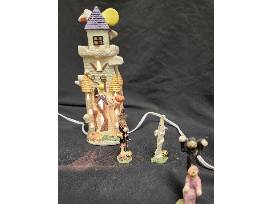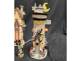 10 Piece Lighted Porcelain Halloween Village (See Photos) Set includes 4 Buildings, 5 Monsters and 1 light cord. Moon is broken on one building.