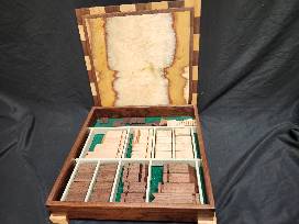 Styled in a mid-century modern style. The woods are predominantly walnut and maple with a little plywood as a stiffener. Actually, this is not only a chess set, but there is a set of square checkers inside also. This set is finished with a hard wax oil.