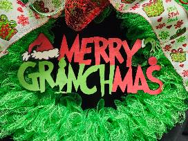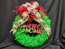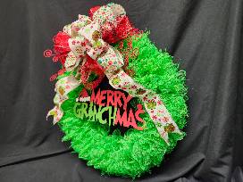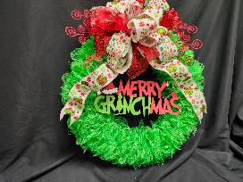 A Handmade (by our very own Kathy Hall) Merry Grinchmas Wreath is a charming and whimsical way to bring the spirit of the holiday season into your home with a playful twist on the traditional Christmas wreath.