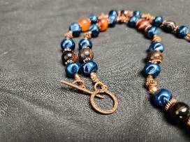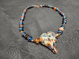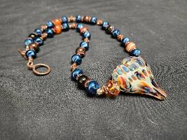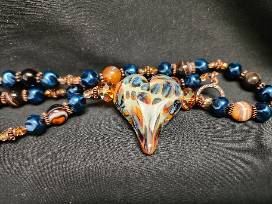 Necklace strung with dark blue glass pearls, Carnelian gemstone beads, Botswana Agate gemstone beads, Czech crystals and a large lampwork glass heart focal pendant. Beautiful warm colors with copper accent spacer components and copper toggle clasp. Crafted by Lori Watson