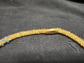 Kumihimo weave necklace made with gold and light blue Japanese seed beads and two sizes of Unicorne lampworked boro glass teardrop beads with a magnetic clasp.