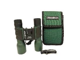 Olive green binoculars with bright orange lenses. The lenses are capable for seeing up to 79mm to 1000mm in beautiful quality. Eddie Bauer carrying case with a tiny side pocket for the small folding locking knife. Carabiner attachment to secure to belt or pack.