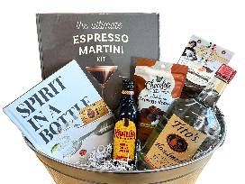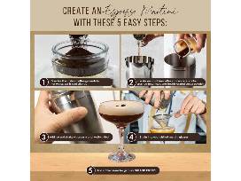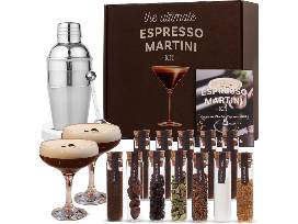 Elevate your martini game with this espresso martini set, it features everything you need: a premium shaker with strainer, 6 tubes of rich coffee grounds, 2 elegant martini glasses, and a measuring teaspoon and tablespoon for flawless cocktails every time.