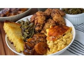 Main course: Choice of Salmon Croquettes OR Smothered Chicken OR Pork Chops OR Mississippi Roast; Macaroni & Cheese OR Candy Yams; Collard greens and Cornbread.