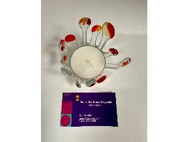 This is a colorful and unique fused glass candle holder. The candle holder is clear glass with red, yellow and blue rectangles and includes the candle. It is handcrafted by local glass artist Ann Snyder. Approximately 5" round.