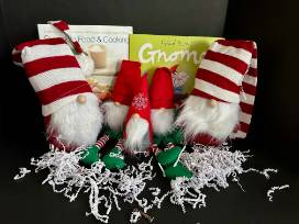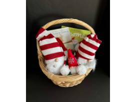 Created by local author Janet Martin, this Scandinavian Gnome Gift Basket is sure to bring smiles this holiday season! Filled with fun items including a Swedish Food and Coloring Book, a Children's Gnome Book, 2 Elf on the Shelf Gnomes, 2 Stocking Hat Gnomes, and a Snowflake Christmas Tree Ornament.
