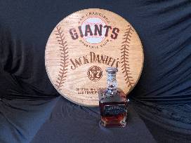 • Branded barrel head tavern sign with San Francisco Giants and Jack Daniel's logos.
