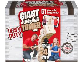 Test your skill and dexterity by carefully removing the giant, wood blocks piece by piece-but be careful or else the tower will fall and you will lose! When stacked, the tower measures 48" for giant-sized fun. Gather your friends and family and play inside or outside! Giant Jumbling Tower is great for tailgaters, barbecues, picnics, parties, and everyday fun in the play room. Includes 51 blocks.