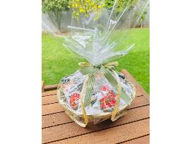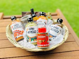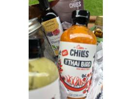 Basket includes: The Whole Family of sauces (Habenero, Jalapeno, Thai Bird, and Mustard), Partanna Extra Virgin Olive Oil, balsamic vinegar, pure maple syrup, and glass container