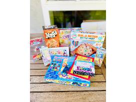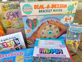 Basket of toys (Including: Jenga, BFF Rainbow Loom, Aquabeads, Dial-a-Design Bracelet Maker, and other toys)