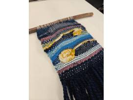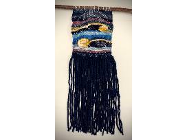 Tapestry wall hanging. Students took turns weaving rows on this Starry Night inspired tapestry. Measures approximately 10" wide 24" long.