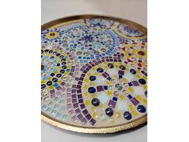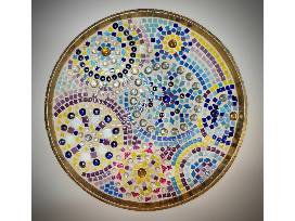 Mosaic Tile Tray - Students used knowledge of radial symmetry to create mosaic designs on a gold metal tray. Measures 17.6" in diameter.