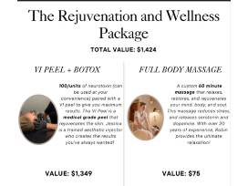You'll receive VI Peel & Botox (100/units of neurotoxin - to be used at your convenience- paired with a VI peel to give you maximum results. The VI Peel is a medical grade peel that rejuvenates the skin, Jessica is a trained aesthetic injector who creates the results you've always wanted! Along with a FULL BODY Massage - A custom 60 minute massage that relaxes, restores, and rejuvuvenates your mind, body and soul. This massage reduces stress, and releases serotonin and dopamine. With over 20 years of experience, Robin provides the ultimate relaxation.