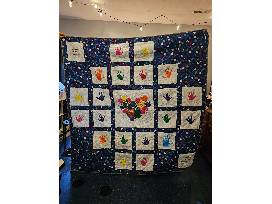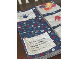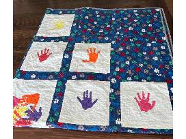 Cuddle up in this precious keepsake from Mrs. Sager's Pre-K students. Quilt is made of fabric in puppy prints and includes the handprint of each student.