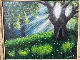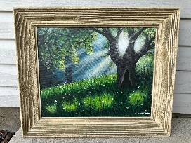 Hand painted landscape by Mrs. Trista Davis, our very own high school art teacher. Landscape features a large tree in a field of wildflowers with sun shining through. Landscape is painted on a 16x20 inch canvas and is displayed in a 21x25 inch frame.
