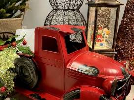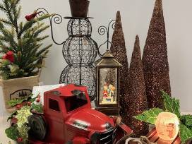 This spectacular display starts with a large metal snowman with hands that can hold Christmas cards, a lantern that lights up, plays music, and contains a snowman family in a snowy place, two gold sparkle deer relaxing, a bucket of red and gold sparkle Christmas tree ornaments, plenty of multicolor sparkle berries, and five assorted candle holders are included.