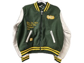 Elevate your wardrobe with this stylish WEAR by Erin Andrews set, featuring a Green Varsity Jacket (L) and a Women's Chenille Woven Patch Stripe Pullover Sweater in Cream (L).