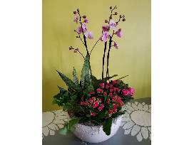 Enjoy this English Garden in a ceramic planter with pink orchid, kalanchoe, snake plant.