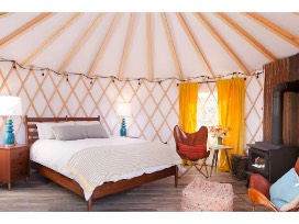 Inside, a plush queen-size bed welcomes a solo traveler or couple, complemented by thoughtful amenities: a bottle of wine, a coffee and tea cart, a prepped woodfire, and a heated bed for extra comfort. Wander scenic trails, take a dip in the pond, and, depending on the season, enjoy a basket for berry and flower picking, fresh snowfall for snow angels, or a breathtaking display of autumn leaves.