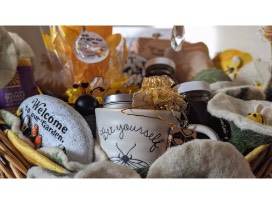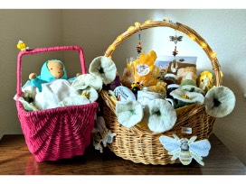 And complete with a pink wicker basket adorned with a hand felted Honeybee