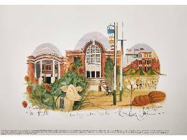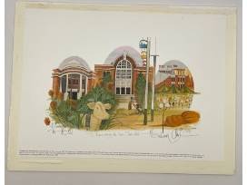 "Remembering the Iowa State Fair" This signed and numbered lithograph (408/500) was issued in 2009 and features the Ag Building, Grandstand, SkyGlider and butter cow. It is unframed and mounted on foam core. Approximately 10.5" x 14.5".