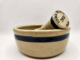 The 2016 mortar and pestle was created by Becky Day of Willow Avenue Pottery. The bowl is 6.25" x 2.5" with the matching pestle at 4.75" x 2".