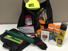 Be prepared with this vehicle care kit! This package includes a trunk organizer, jumper cables, roadside kit, fix a flat, tire gauge, car cleaning supplies, car air freshener, blanket, hi-vis cap, and an umbrella.