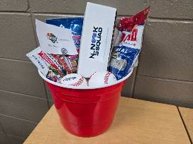 Take me out to the ballgame baseball basket. Basket includes $50 gift certificate to D-Bat's in Champaign, Nooksquad midnight Berkeley Black sunglasses, Big League gum, Dubble bubble gum, sunflower seeds and 2 baseballs.