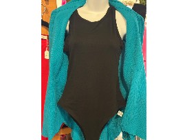 The boutique outfit includes a medium lightweight Zenana jacket with a black bodysuit tank accessorized with an over-the-shoulder black braided purse & Pure "Smells Like" Marc Jacobs Dot perfume.